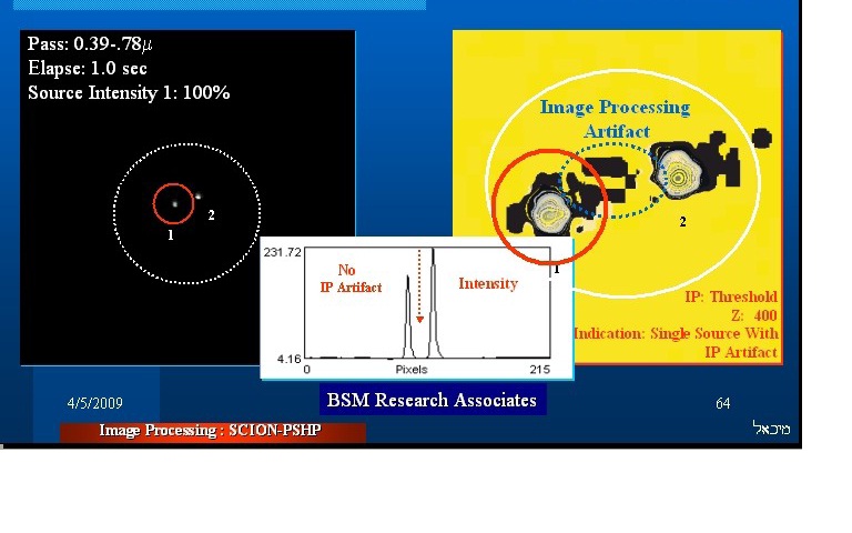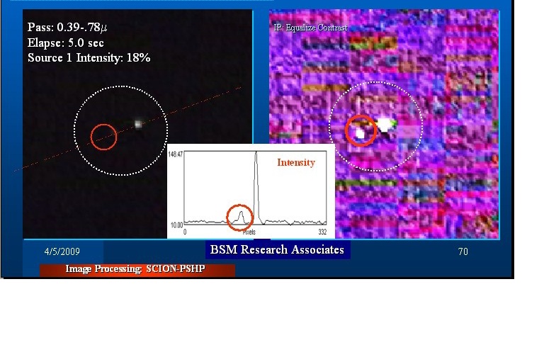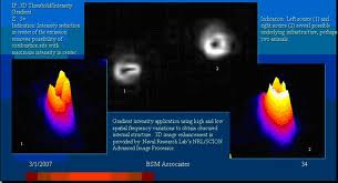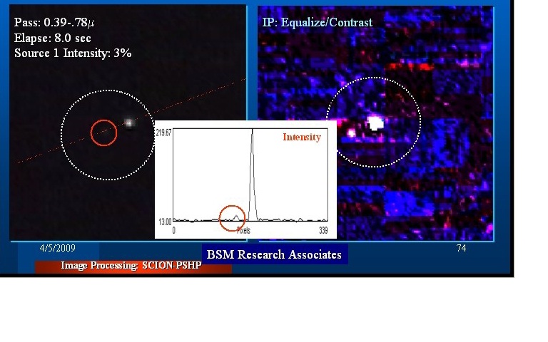 After arriving back in the United States, Cliff Paiva, with BSM Research Associates, did a computer enhanced analysis of the video.  His enhancement was done with computer programs, checking edge gradients and radiation intensity.  The plates which follow are the results of Cliff’s analyses.  The first plate below shows the radiation intensity for both objects. The whiter the color the more intense is the radiation, so farther away from the body naturally shows a weaker intensity. The absence of radiation intensity in the “body” is certainly unique.  If this had been a fire, flashlight, or any type of artificial light source, the center would have the most radiation intensity and not be devoid of radiation intensity as this analysis demonstrates.